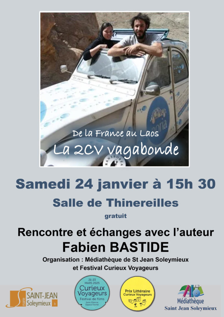 A Thinereilles samedi 24 janvier à 15h30 venez dialoguer avec Fabien Bastide, l'auteur de La 2CV vagabonde, de la France au Laos. Son livre fait partie de la sélection littéraire du Festival Curieux Voyageurs. Gratuit, ouvert à tous !